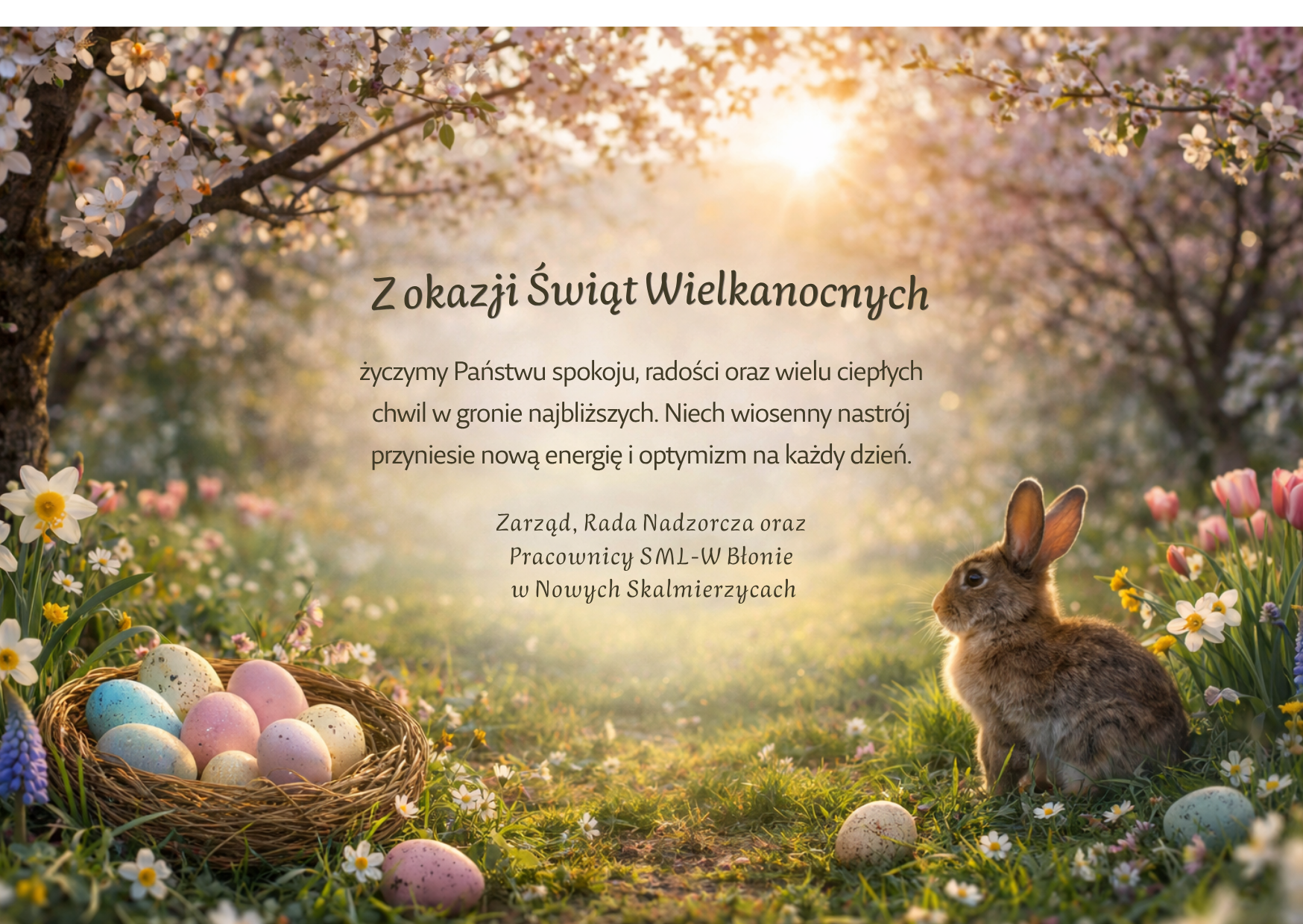 Z okazji Świąt Wielkanocnych 31 marca 2026 życzymy Państwu spokoju, radości oraz wielu ciepłych chwil w gronie najbliższych. Niech wiosenny nastrój przyniesie nową energię i optymizm na każdy dzień. Zarząd, Rada Nadzorcza oraz Pracownicy SML-W Błonie w Nowych Skalmierzycach