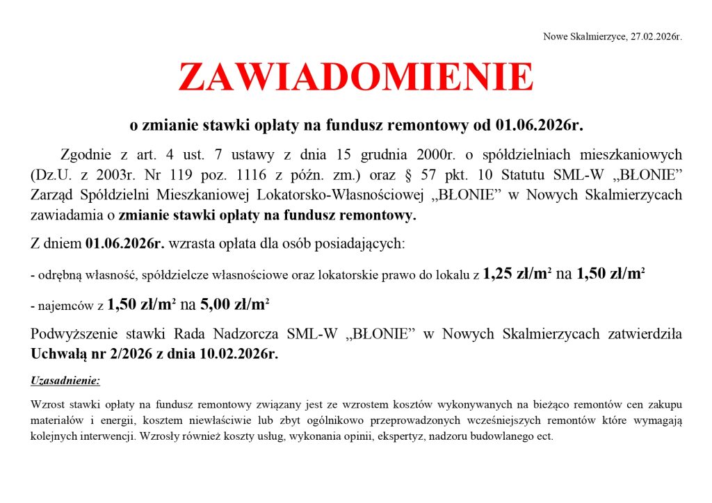 Zawiadomienie o zmianie stawki opłaty na fundusz remontowy od 01.06.2026r.