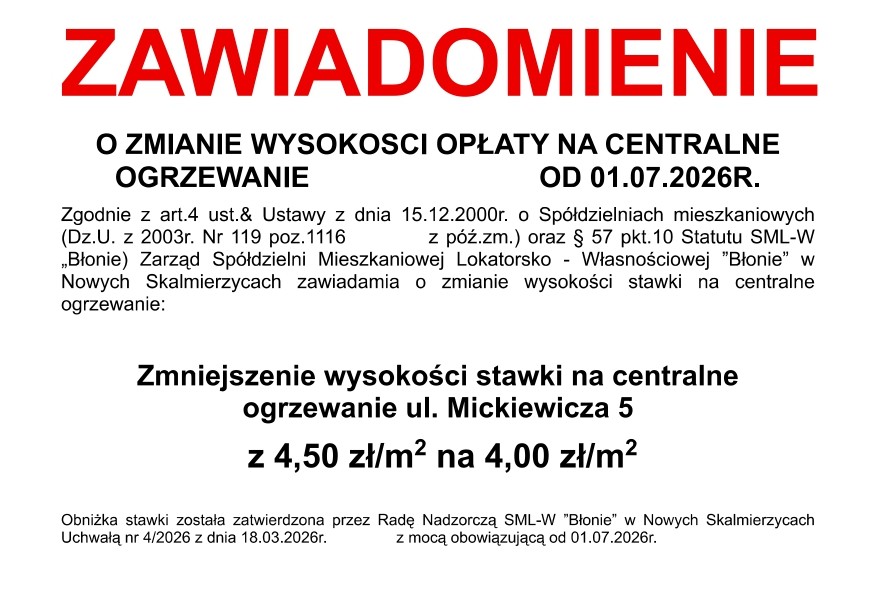 Zgodnie z art.4 ust.& Ustawy z dnia 15.12.2000r. o Spółdzielniach mieszkaniowych (Dz.U. z 2003r. Nr 119 poz.1116 z póź.zm.) oraz § 57 pkt.10 Statutu SML-W „Błonie) Zarząd Spółdzielni Mieszkaniowej Lokatorsko – Własnościowej ”Błonie” w Nowych Skalmierzycach zawiadamia o zmianie wysokości stawki na centralne ogrzewanie: